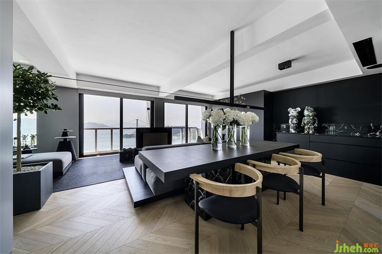 香港私宅設(shè)計整體動線以客餐廳為主體向四周擴散,利用體塊或材質(zhì)自然區(qū)分,過渡自然,最大地利用180度的窗戶敞開面形成縱向的視覺延展,實現(xiàn)人與人、室內(nèi)與室外的零距離的對話。