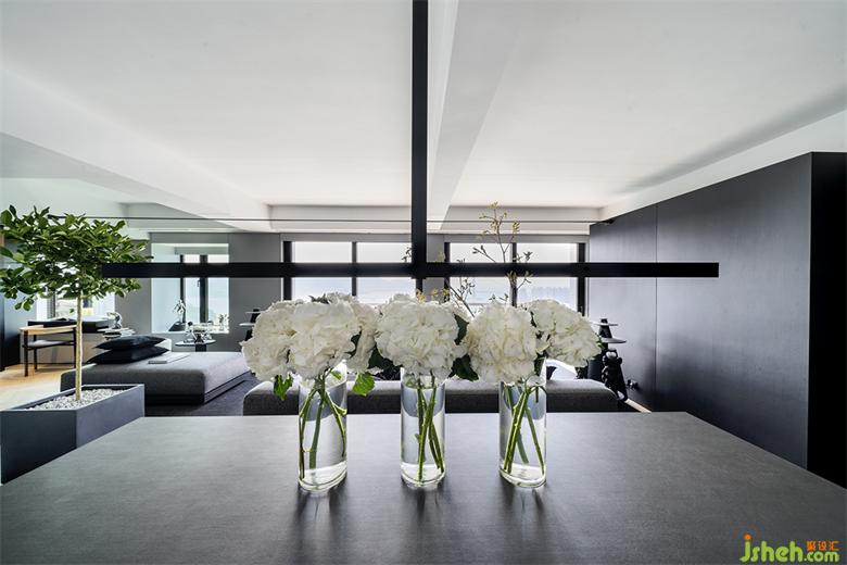 居住者可以輕松游走于每個空間,它們之間的界限并不十分明確,模糊邊界的處理手法看似隨意,實則經(jīng)過平衡業(yè)主的功能需求后,香港私宅設(shè)計精心研究出完整合理的布局形式。于此,空間中自由的流動力量呈現(xiàn)為無處不在的通透感與趣味性。