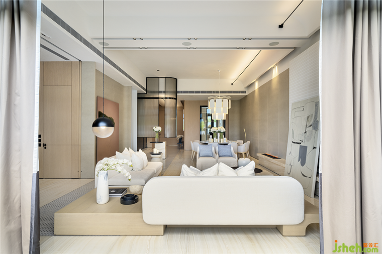 一盞白色薄片金屬整齊排列的吊燈以優(yōu)雅別致的魅力成為餐廳主角;別墅裝修設(shè)計(jì)車線卡其色人造皮及淺色木飾面的大面積導(dǎo)入,盡顯溫暖簡(jiǎn)約的居住氛圍。