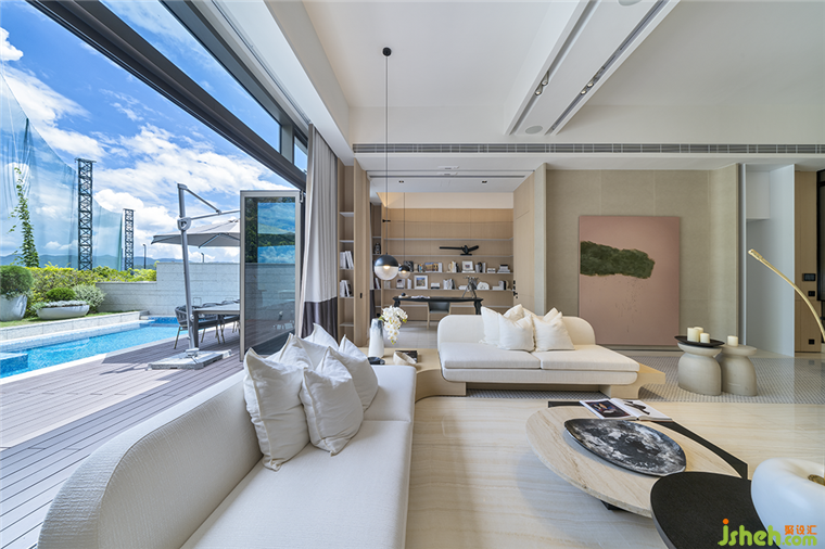 趟折式玻璃幕門連接逾千呎的大花園,私享七米長(zhǎng)的大泳池,與自然建立起聯(lián)系與互動(dòng),室內(nèi)外貫通,光影自由穿梭,空間感更加舒坦,花園成為房屋自然的延伸,視線也因此愈加滲透。