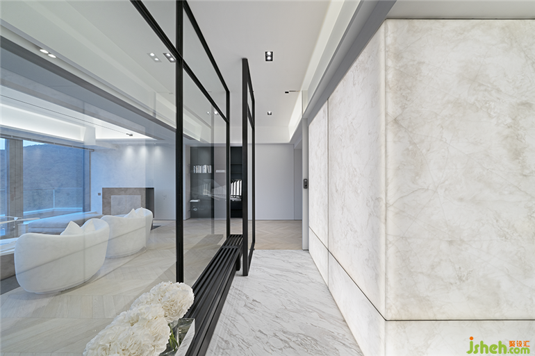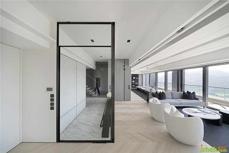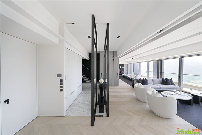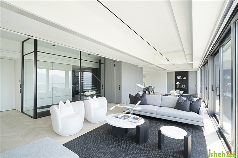 全開放的自由空間,開合有序,結(jié)合低調(diào)明快的現(xiàn)代元素的家居陳設(shè),黑白灰的色彩組合比例恰到好處,精心設(shè)計(jì)的家具擺放位置形成自然的邊界劃分,與天花的線性系統(tǒng)燈具上下平行,加深了視覺(jué)延伸感與流動(dòng)感,香港私宅設(shè)計(jì)塑造深邃寧?kù)o且輕盈通透的空間調(diào)性。
