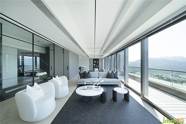 橫向超長(zhǎng)的客廳,因地制宜,全落地玻璃窗提供了直接的視野,香港私宅設(shè)計(jì)打破內(nèi)外界限,不經(jīng)意間將室外的自然光線與滿山黛綠引入室內(nèi),放眼之處,盡是壯麗的自然風(fēng)景。在潛移默化的全開放的空間氛圍中,外界的紛擾嘈雜,慢慢代謝消解,直至煙消云散。
