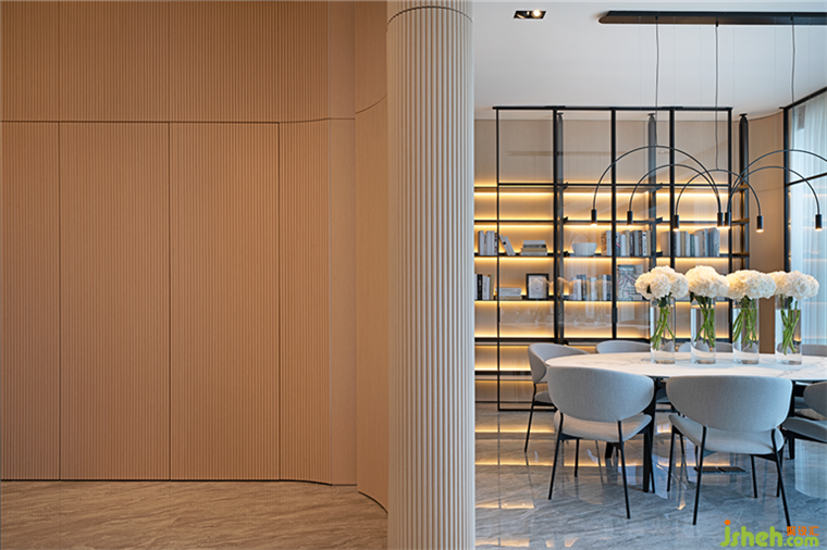 圓弧形與倒角的元素大量使用,弱化了部分立面墻體與個(gè)別材質(zhì)的鋒利冰冷,香港駿嶺薈私宅設(shè)計(jì)流暢的線條感亦展現(xiàn)出舒適松弛的空間語言。