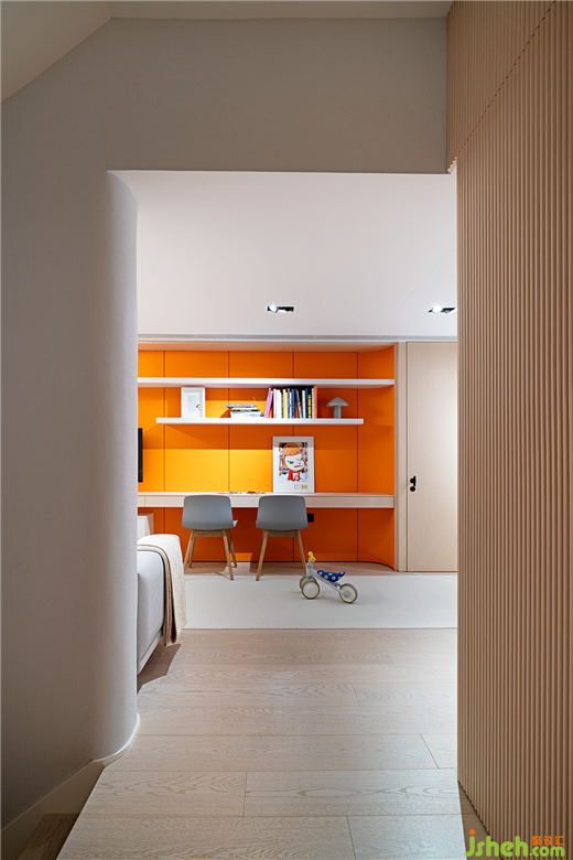 一抹活力滿滿的橙色點(diǎn)亮了二層的多功能公區(qū),這里可以是父母陪伴孩子閱讀寫作的親子空間,也可以是屬于小朋友獨(dú)自探索未知世界的私享天地。香港駿嶺薈私宅設(shè)計(jì)所有臥室與小客廳形成動(dòng)靜分區(qū),兼顧家庭成員各自的生活習(xí)慣,互不打擾,但有所照應(yīng)。