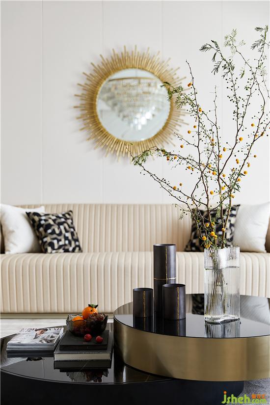 在玄關(guān),圍繞主題展開的蜂巢造型端景臺(tái),通過幾何變換延伸出輕盈別致的藝術(shù)性。裝飾畫似金色玫瑰優(yōu)雅綻放,又仿若花蜜清瑩欲滴,恰到好處點(diǎn)綴了空間的視覺中心,勾勒出彬彬有禮的迎迓場(chǎng)景。