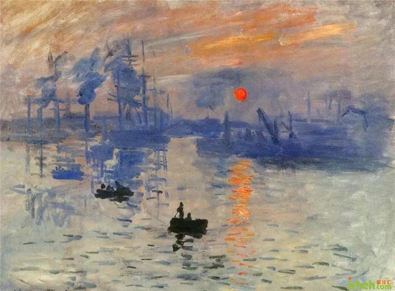 在家鄉(xiāng)勒阿弗爾港眺望到藍(lán)色的海面上,橙紅色的日出緩緩升起,莫奈懷著熱情創(chuàng)作了《日出·印象》。