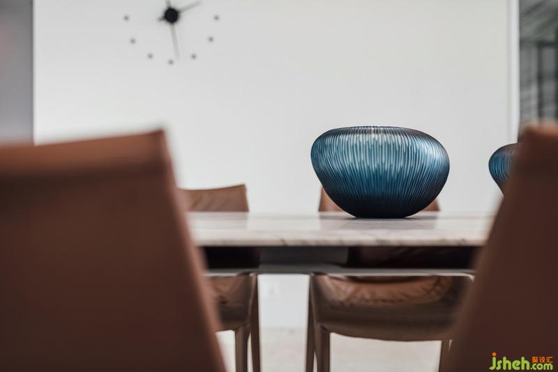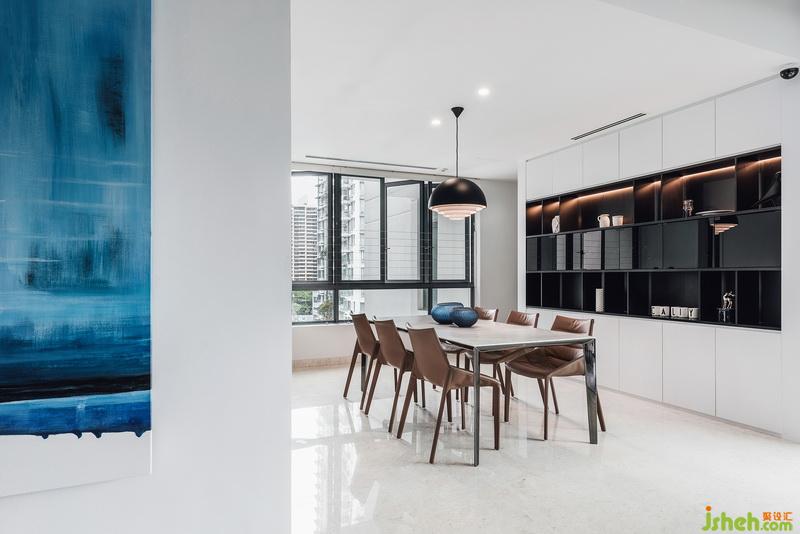 空間整體的中性淺色調(diào),亦營(yíng)造出最干凈溫和的視覺(jué)觀感,同時(shí)輔之較大面積的靛藍(lán)色塊與之搭配,設(shè)計(jì)公司用冷調(diào)降低新加坡四季炎夏的灼熱感