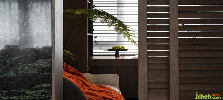 搭以溫潤(rùn)的咖色木飾面和肌理感的綠色大理石。