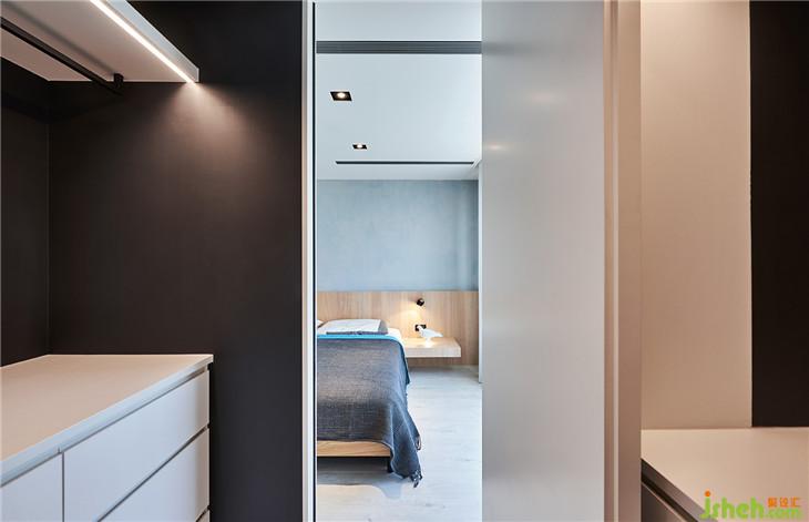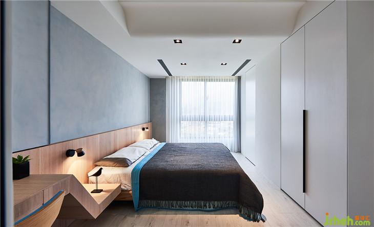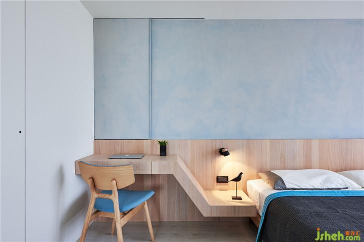主臥床頭墻面,也是硅藻土材質(zhì)調(diào)成藍(lán)色,墻面也隱藏一個(gè)拉門(mén),拉開(kāi)底下就是鏡子功能。