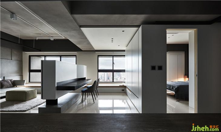 因為屋主很好客,所以我們讓這空間的主要核心就是中島,利用地坪界定兩個區(qū)塊,灰色無縫地坪隱涵著土地從入口延伸到餐廳,透過皺褶的鐵件縫隙隱約看見土地上長出的中島,區(qū)隔的白色磁磚面地坪象征水的意象,電視像是墻懸空在水面上的量體