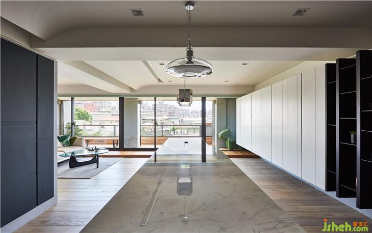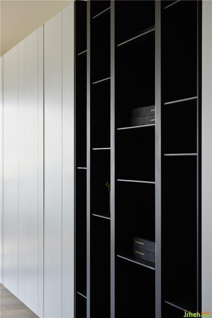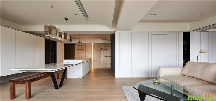 右側(cè)為主要收納空間,盡量將收納集中在同一邊,讓空間呈現(xiàn)最大開(kāi)放性