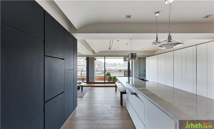 廚房地面與玄關(guān)材質(zhì)延伸,使用一種意大利無(wú)縫地坪材料
