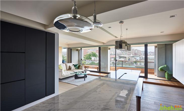 一進(jìn)到這空間,就看見(jiàn)一個(gè)大理石中島+餐桌,看不到傳統(tǒng)以電視為核心的機(jī)能 前方被我們內(nèi)縮加大的陽(yáng)臺(tái),就變成這空間最棒的背景,會(huì)隨四季變化而有不同味道