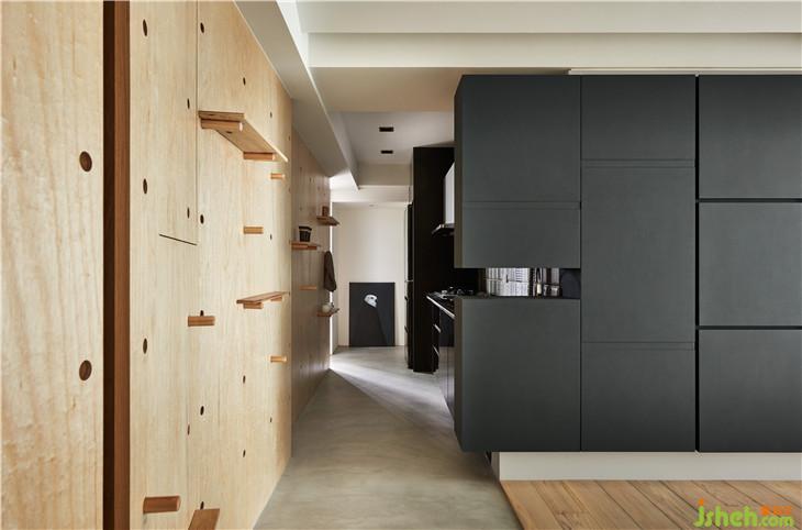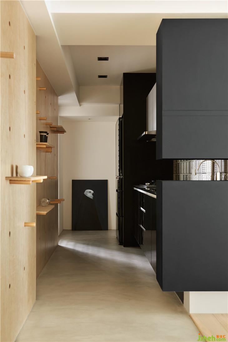 維持建筑物原有廚房位置,除了管線較不需拉過(guò)長(zhǎng),也藉由材質(zhì)與局部穿透,讓空間盡量純粹,右側(cè)黑色量體表面使用黑板漆,變成可以涂鴉或?qū)⑸罴o(jì)錄的墻面,里面也是所有廚房家電收納的空間。