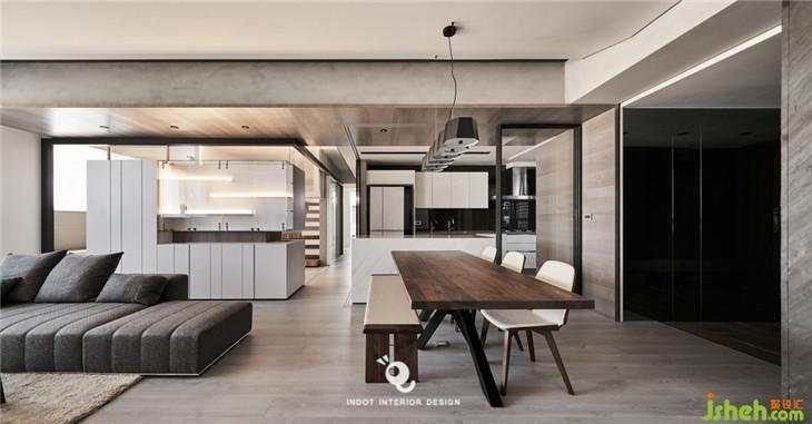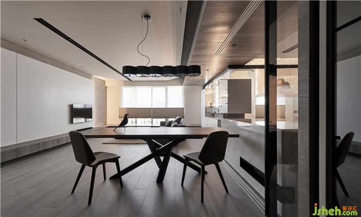入口側(cè)墻整面的穿衣鏡使用灰鏡,大門一進(jìn)到空間就看見(jiàn)造型感強(qiáng)烈的桌子,也變成一個(gè)視覺(jué)端景。