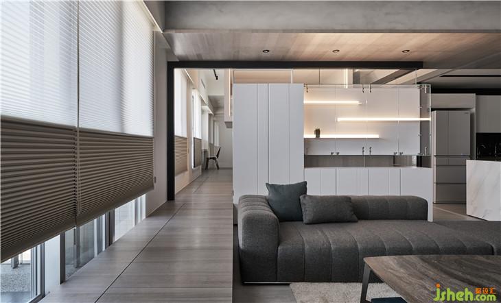 因?yàn)樘旎ǜ叩筒钜约傲旱年P(guān)系無(wú)法施作拉門軌道,所以用鐵件設(shè)計(jì)了一個(gè)軌道盒 除了可以將拉們做一個(gè)平面的整合,也可以變成一種線條延伸的造型。
