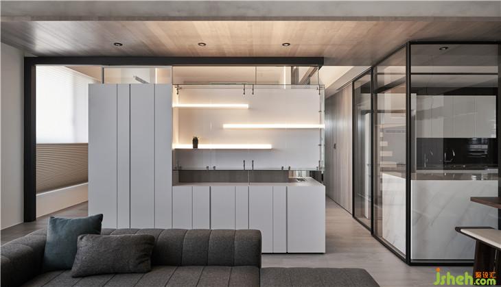 從客廳隱約看見(jiàn)前方展示柜量體后面的玻璃盒子,透過(guò)這樣的置入一個(gè)盒子的手法,改變了對(duì)于生活視角的想像,產(chǎn)生了看與被看的生活趣味。