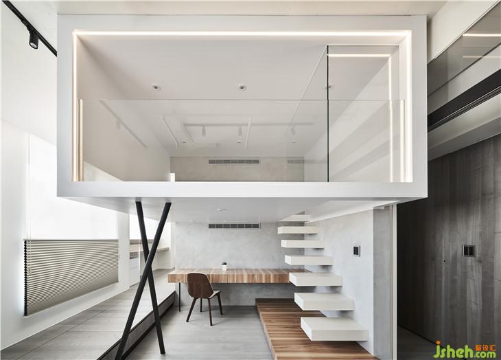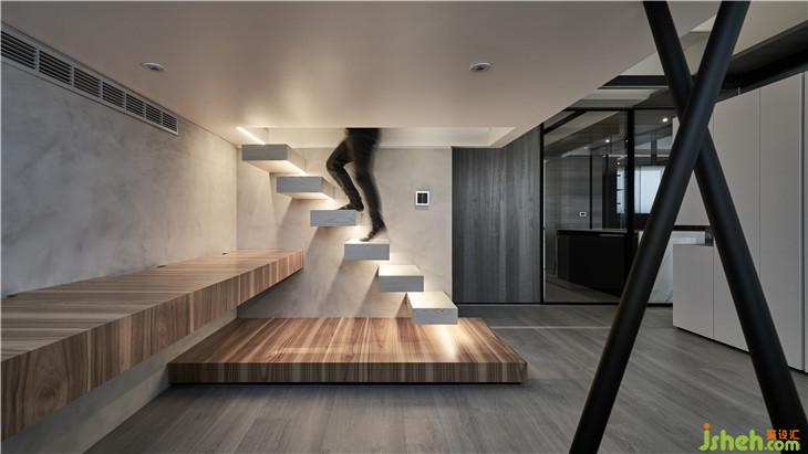 光盒下方為書房空間,我們讓階梯崁入墻內(nèi)下方內(nèi)崁LED燈,有一種輕巧感。