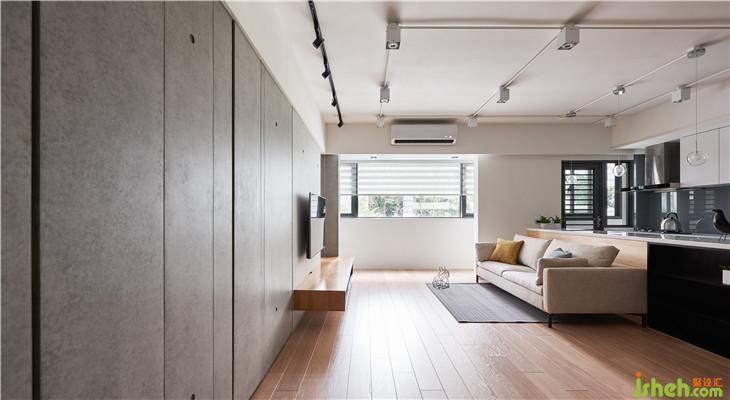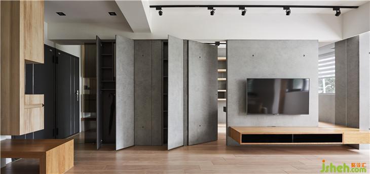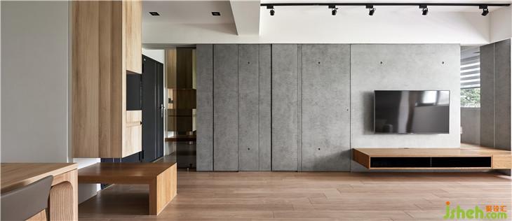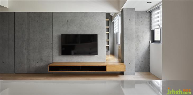 左側(cè)收納柜延伸到客廳電視墻,我們利用清水模把整面墻整合