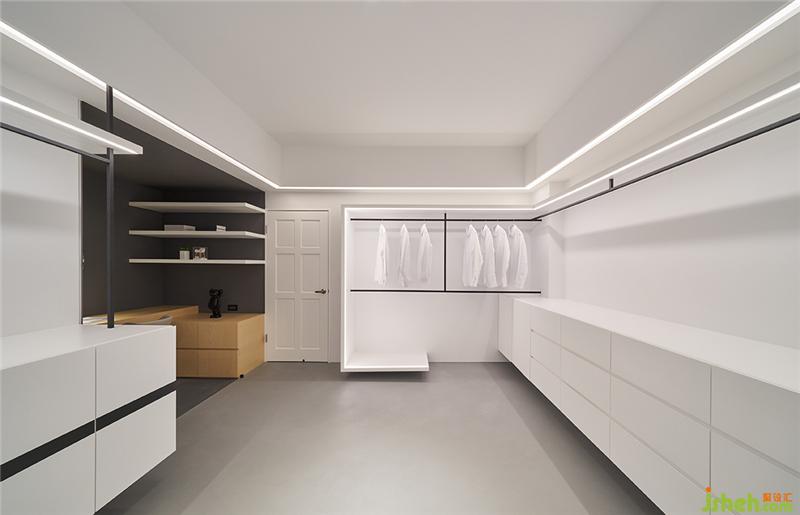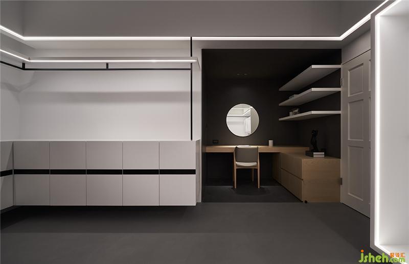 因?yàn)槿龢怯蓄A(yù)留客房,所以二樓原來房間整個(gè)就可以變成超大更衣室,不管大衣或是折的衣服都有足夠的空間使用;我們?cè)O(shè)計(jì)一個(gè)黑色色塊空間,變成屋主的化妝空間;更衣室也保留原來窗景,看出去就是舒服的綠樹。
