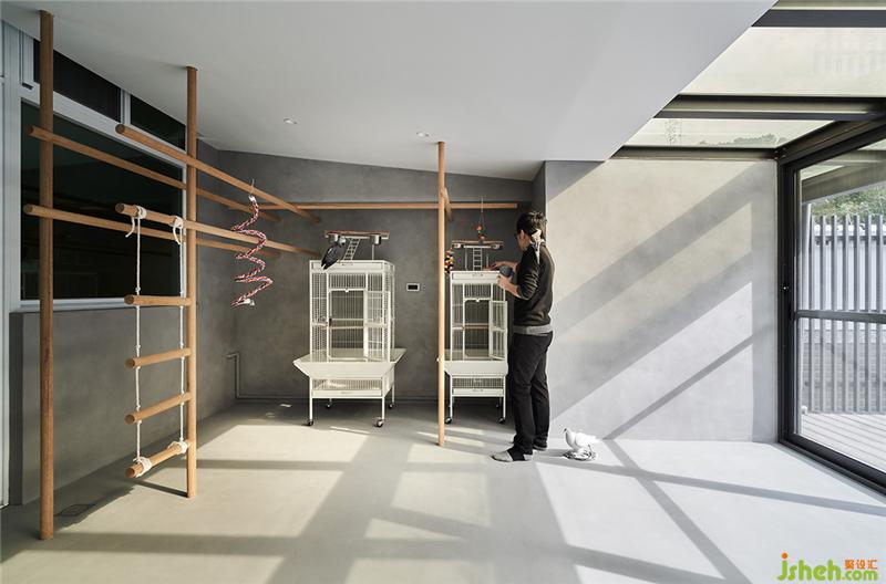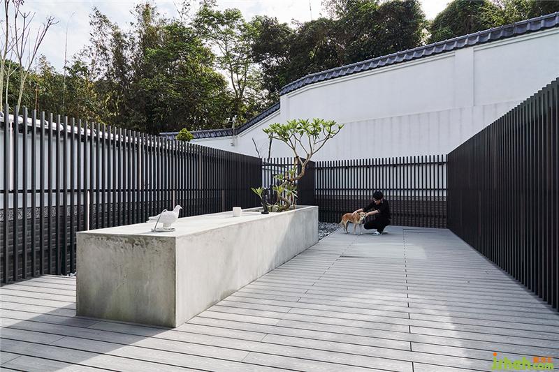 戶外區(qū)原來建商只是貼貼磁磚,我們就建議屋主可以整理一下,地板鋪個塑木地板,圍牆用隔柵修飾,并刻意在中間做了一個隆起的水泥塊體,可以種植栽,也可以變成中島的概念,這裡是狗狗的游戲天地臺灣裝修設計。