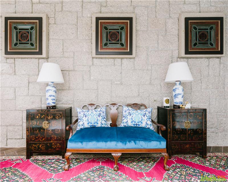 玄關區(qū)艷麗的波斯地毯,注入這棟老宅空間新的活力,換鞋椅的那抹艷藍色和地毯的玫紅有了強烈的沖突感,這種沖突感所組成的驚艷,讓并列兩旁描金的古董裝飾柜也有了生機和活力,青花瓷的臺燈和抱枕有了輕輕的互應,中西之美在并不大的玄關區(qū),有了這么多的內(nèi)容交措,所呈現(xiàn)SCD最善長的混搭手法;倚在門廊上的白色鸚鵡,和門外自然堆起的綠植花藝,滿滿的生活情趣和氣息。設計公司