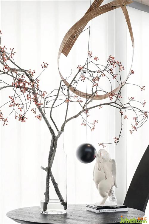 入口接待處的長凳猶如嶙峋的怪石,搭配清透如水的茶幾,一虛一實,與窗外華陽湖的翠綠,宛如天然的畫卷,沁人心脾。藝術(shù)有時候是一種抽象的精神姿態(tài),是一種主觀的感受。