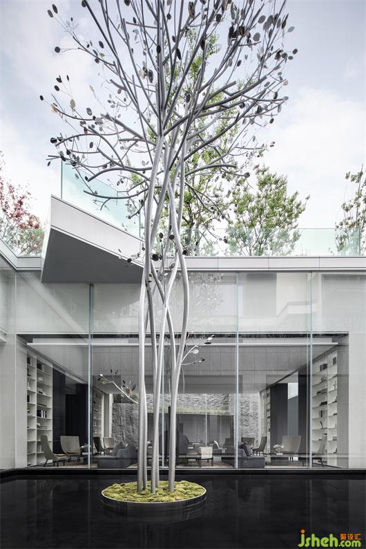 洽談區(qū)簡潔界面與和諧比例共同營造出的柔性向度,隔離了外界喧囂,使觀者逐漸平靜下來。序列、對稱、圍合、收放、虛實、造就空間層次。陽光的引入,斑駁交織的光影隨著時間的推移,在地面、墻面勾勒不同的形色。