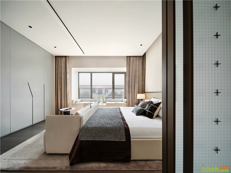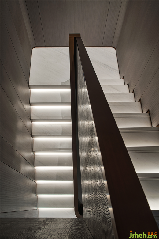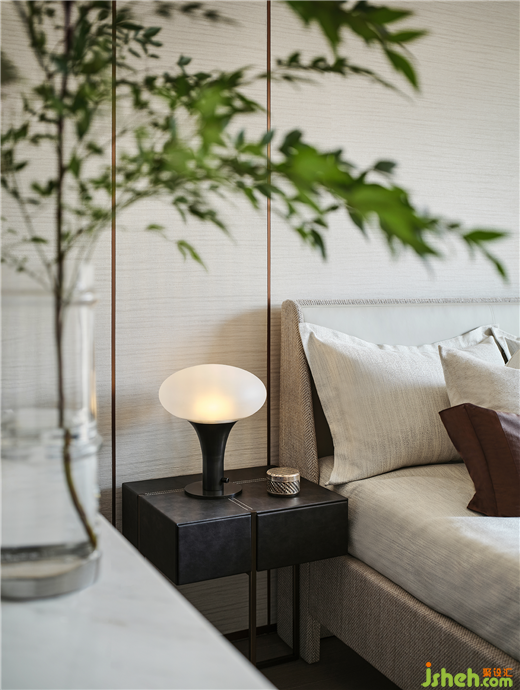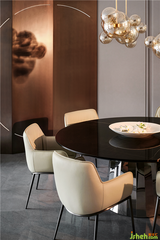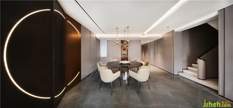 從客餐廳過渡到臥室及書房,空間的穩(wěn)重感逐漸增強(qiáng),冷靜而情感細(xì)膩的調(diào)性,而這一切,無需張揚(yáng),豪宅設(shè)計(jì)只需以簡(jiǎn)馭繁,靜默喚醒;無論是日間穿透窗戶自然的光線,還是夜間氛圍柔和的照明情景,無論是與家人聚會(huì)聊天,還是獨(dú)自休憩放松。