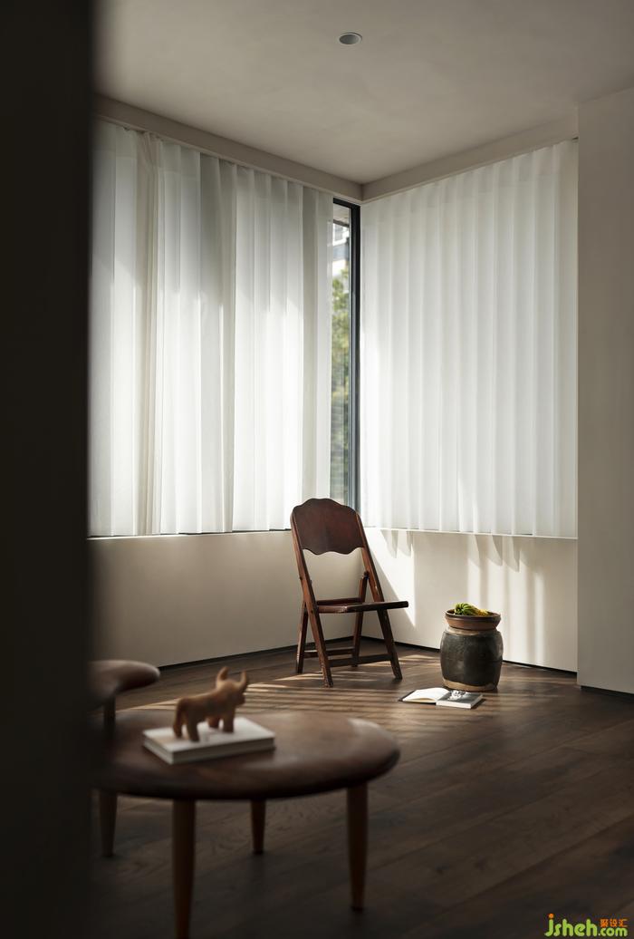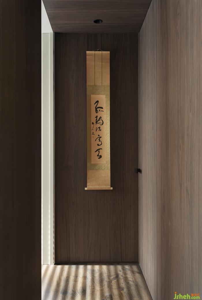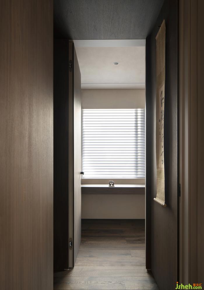 被胡桃木包裹著的走廊,陽光透過百葉窗簾,光影搖曳,定格溫暖。
