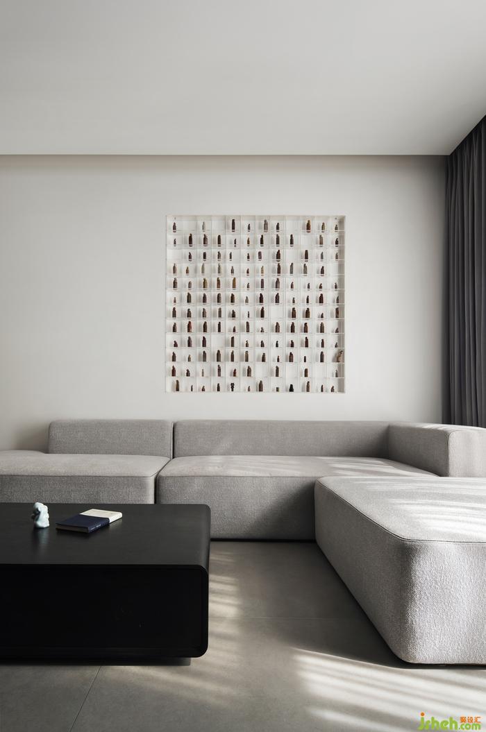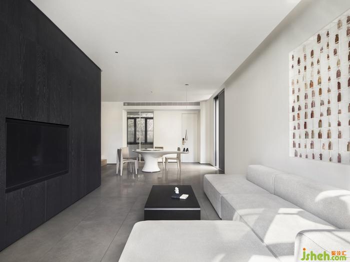黑色橡木板墻體,解決了電視與收納的雙重功能。廣州別墅裝飾富有詩意和哲理的“裝置畫”成為沙發(fā)背景,白居易的古詩“玩山水”讓心變得更加灑脫坦蕩。