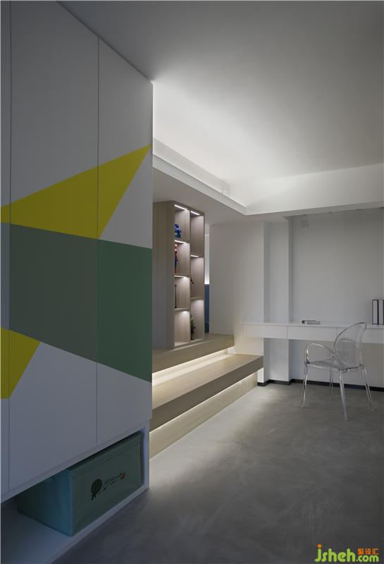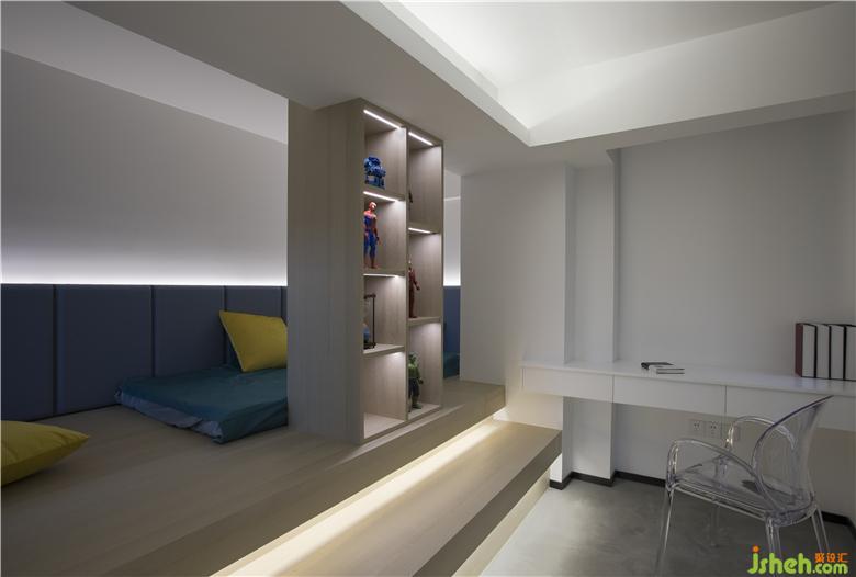 小孩房榻榻米邊上設(shè)置了軟包保護(hù),同時(shí)簡(jiǎn)化了空間脈絡(luò),把盡可能多的空間騰出來,讓收納柜里漫威宇宙的英雄人物陪伴孩子在大片的空地上自由自在的玩耍。