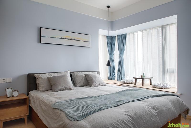 主臥木質(zhì)的家具,窗戶(hù)和清新的淡藍(lán)色墻面,加上自然光線(xiàn),給臥室?guī)?lái)的視覺(jué)效果寬敞又明亮。