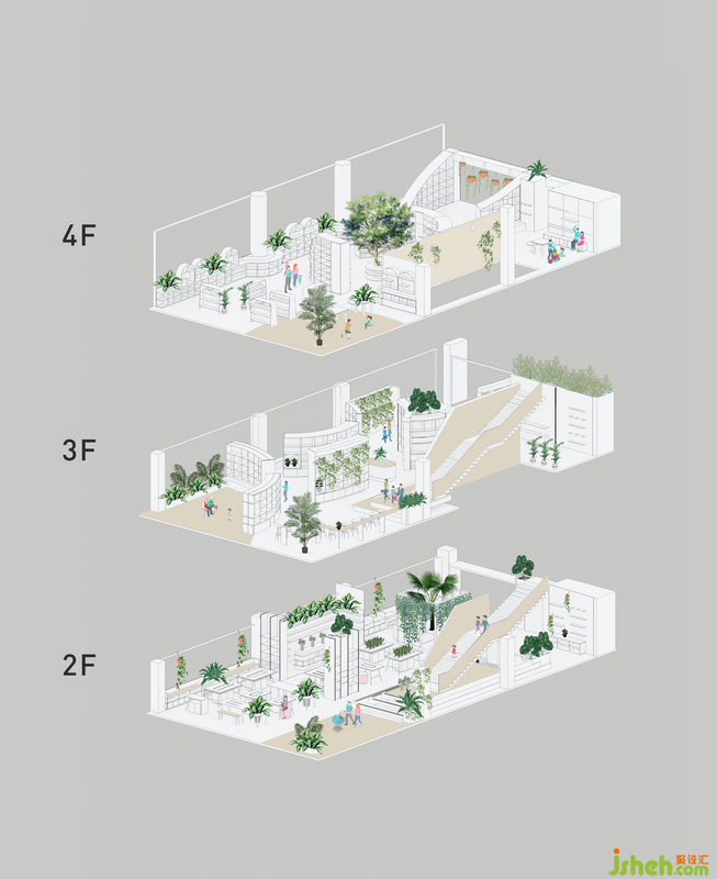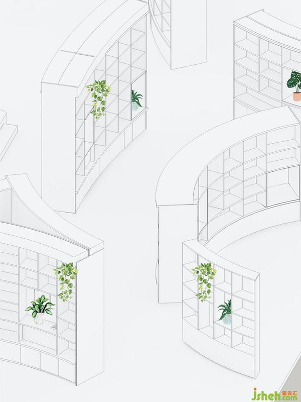 正如植物的氣孔一樣,書(shū)架間的缺口和書(shū)架上的開(kāi)窗為空間創(chuàng)造了“呼吸的節(jié)奏”,圍繞著開(kāi)窗書(shū)店將設(shè)置主題性的場(chǎng)景式書(shū)籍陳列。讀者動(dòng)線在其引導(dǎo)下呈隨機(jī)的曲線,尋書(shū)體驗(yàn)也變得有趣起來(lái)。