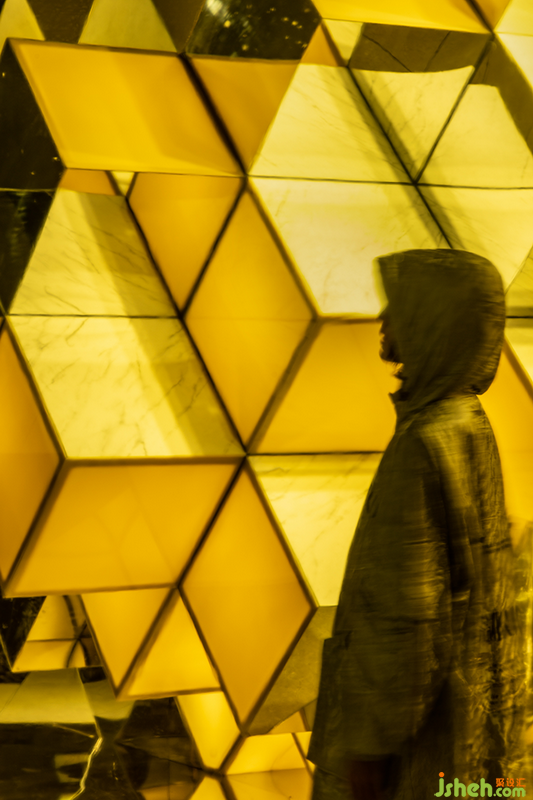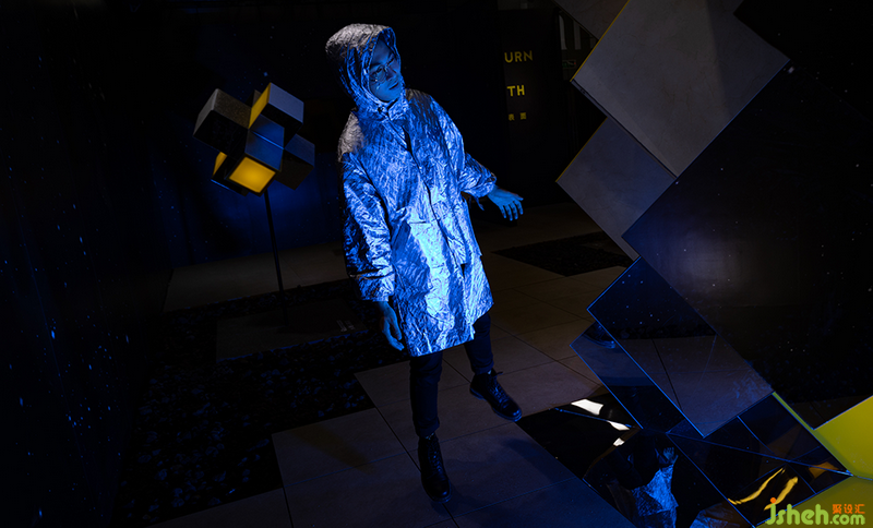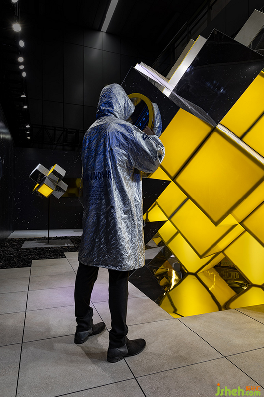 此外,設計師運用繁星閃爍的太空畫面作為背景,而在地面的瓷磚步道之間鋪滿了火山巖顆粒;配合有意壓暗的場內燈光,著力營造展會之中的異次元體驗。