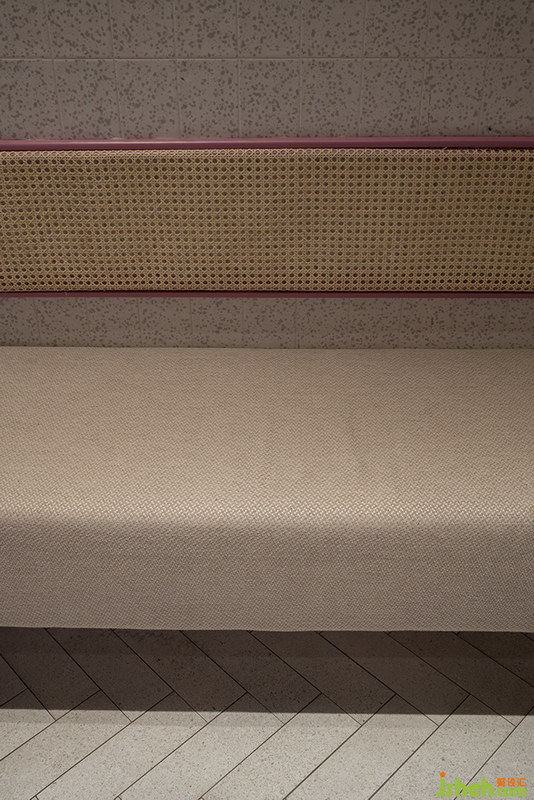麻石磚以復(fù)古人字拼接方式呈現(xiàn),藤編與麻布質(zhì)感則帶來(lái)傳統(tǒng)東方庭院的聯(lián)想。墻面所用定制手工磚上的墨點(diǎn)圖案由制磚師傅隨機(jī)潑墨而成,每塊獨(dú)一無(wú)二的磚都擁有同樣光滑親膚的觸感。