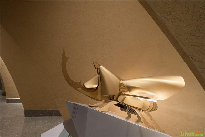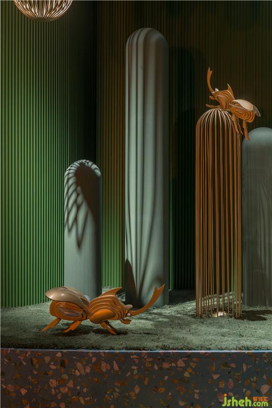 △分布在空間中的獨角仙裝置和地面的金色軌跡串起整個店面空間