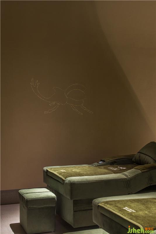 △SPA房的浴池上方使用磨砂玻璃,內(nèi)嵌LED屏幕持續(xù)播放樹蔭斑駁的光影動態(tài)效果。