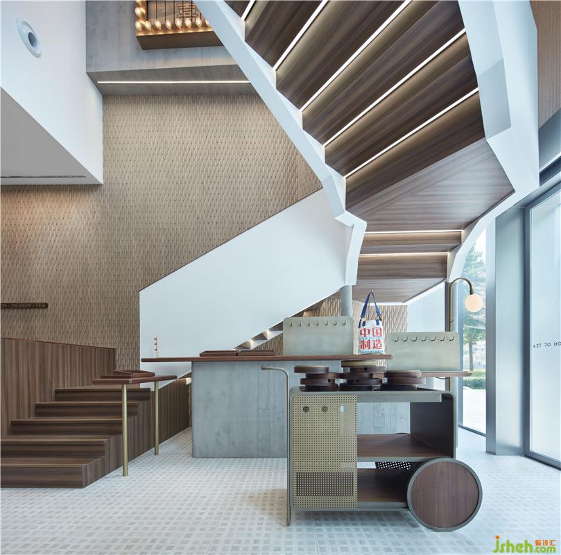 周邊販賣(mài)區(qū)域在臨街入口處,貼合樓梯底結(jié)構(gòu),利用貨架及中島形成了更具銷(xiāo)售氛圍的半圍合小空間。在「茶樓」主題之下,設(shè)計(jì)師對(duì)傳統(tǒng)茶樓中的點(diǎn)心手推車(chē)和蒸籠這些具有代表性的元素進(jìn)行再設(shè)計(jì),構(gòu)建會(huì)講故事的場(chǎng)景。