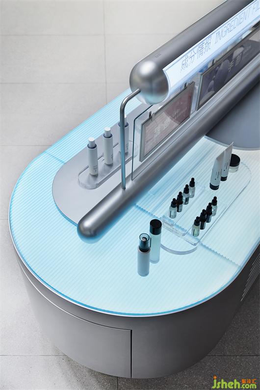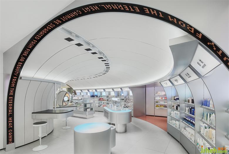 護膚區(qū)的主題島臺通過規(guī)整的陳列道具,渲染專業(yè)化的實驗場景,增加消費者對產(chǎn)品成分的信任感。