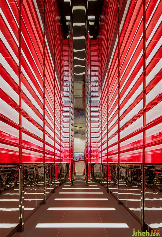 旗艦店設(shè)計(jì)項(xiàng)目選址北京華貿(mào)商圈的核心商業(yè)地段,比鄰SKP購(gòu)物中心,由一棟三層高的舊商業(yè)建筑改造而成。設(shè)計(jì)師利用U型玻璃對(duì)整體建筑進(jìn)行包覆,打造均一的外立面表皮,再置入多媒體動(dòng)態(tài)燈光,呈現(xiàn)白里透紅的燈光效果,在商圈場(chǎng)景中形成帶有品牌宣傳意義的可視媒介。