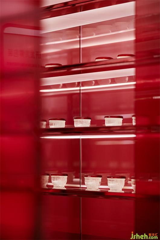 同樣以玻璃材質(zhì)打造的燕窩冰庫(kù),成為整個(gè)空間的核心張力,將品牌強(qiáng)調(diào)的“鮮”這一理念進(jìn)行可視化傳達(dá),通過(guò)重疊、對(duì)稱等設(shè)計(jì)手法,讓空間在這里得到無(wú)限延展。