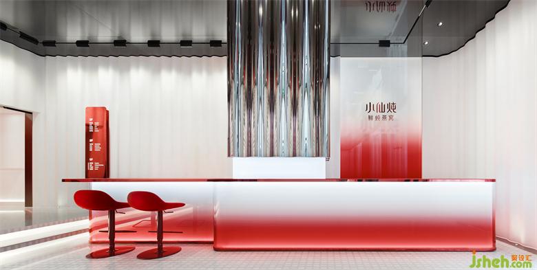 一層接待區(qū)柜臺正好被一根巨大的柱體插入,采用亮面波浪形態(tài)金屬包覆后,柱子被賦予了雕塑感,打破了空間的秩序,形成有趣的反差。