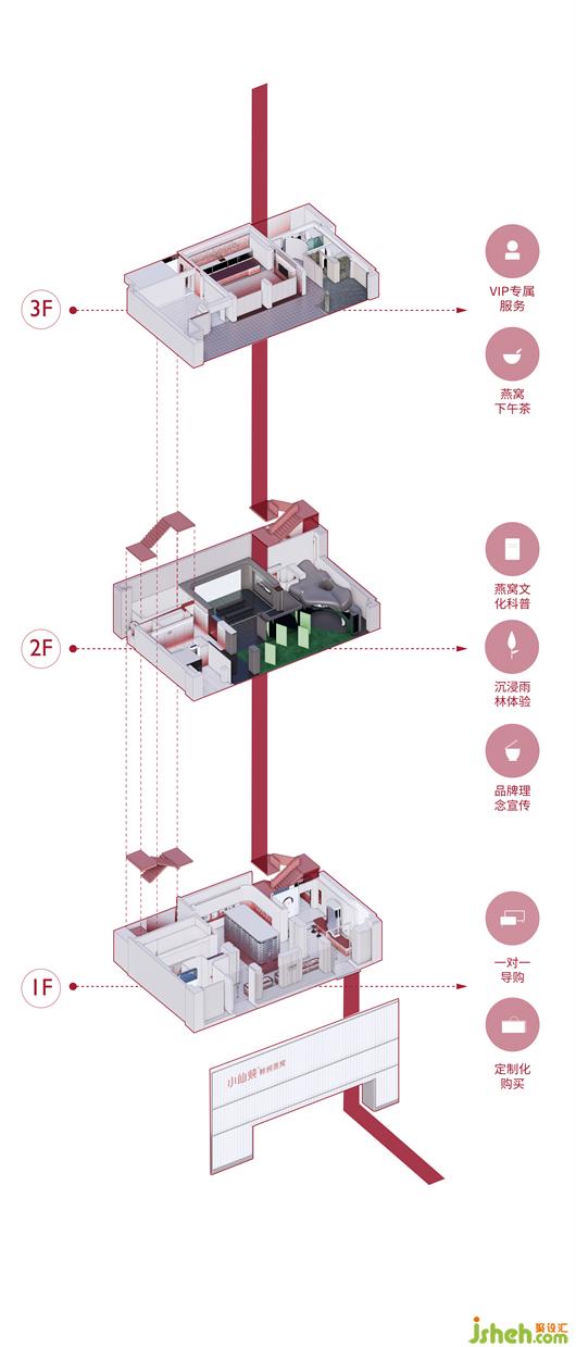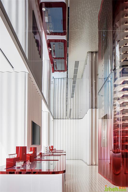 圍繞核心單一產(chǎn)品延展出一個(gè)完整豐富的體驗(yàn)動(dòng)線,旗艦店設(shè)計(jì)師在產(chǎn)品展示的基礎(chǔ)上加入知識科普和文化再現(xiàn)模塊,打造沉浸式的體驗(yàn)空間。一層空間主要以品牌零售為主,通過屏幕互動(dòng)、產(chǎn)品展示以及售后服務(wù)等形式,向消費(fèi)者展示完整的品牌線下銷售空間形象。