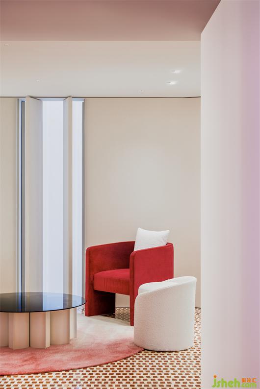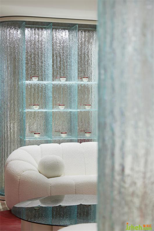 旗艦店設(shè)計(jì)師在VIP區(qū)墻面設(shè)置開(kāi)窗,巧妙地利用外立面的玻璃幕墻與內(nèi)部開(kāi)窗的關(guān)系,引入自然光線,玻璃隔斷隱喻燕窩晶瑩剔透、富有顆粒感的肌理,共同形成一個(gè)半圍合空間,給人舒適的愉悅感。