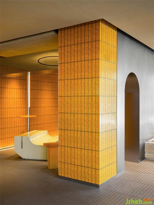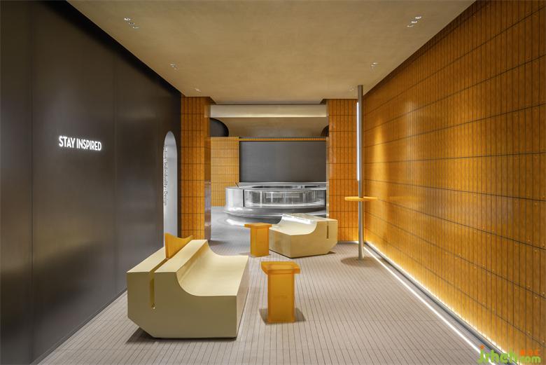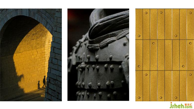 具有標(biāo)志性意義的拱門(mén)被金屬材質(zhì)包裹,宛如一道時(shí)空之門(mén)。喜茶設(shè)計(jì)穿過(guò)這道拱門(mén)進(jìn)入內(nèi)里空間,定制的黃色手工磚上,倒模形成的圓點(diǎn)凸起對(duì)應(yīng)著秦俑士官盔甲特有的鱗片圓點(diǎn),那些模糊的歷史文化印記再次浮現(xiàn)。