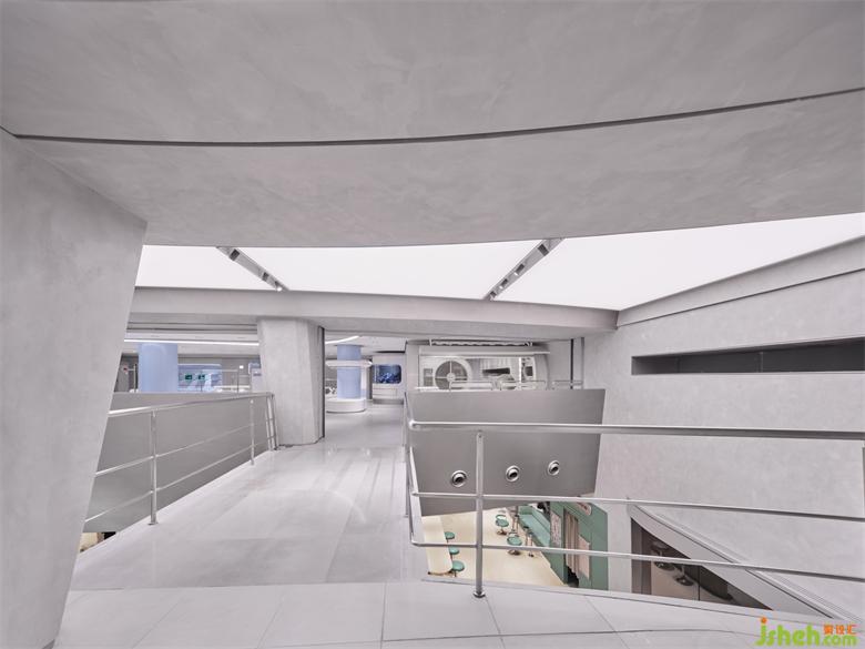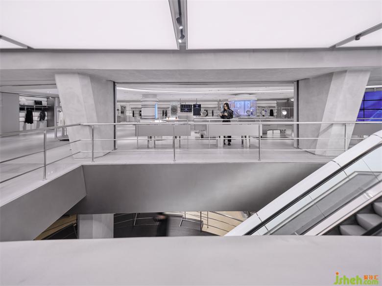主體造型有著20世紀(jì)中葉粗野主義建筑的典型特征,復(fù)古科幻的太空風(fēng)格成為整個(gè)空間的底色。旗艦店設(shè)計(jì)弧形階梯平臺設(shè)計(jì)規(guī)避了扶手梯下方沉箱難題,又與發(fā)光扶手梯相連,通過屋頂柔軟的光源與大型金屬建筑體塊形成矛盾反差,營造通往另一個(gè)空間的神秘昭示。