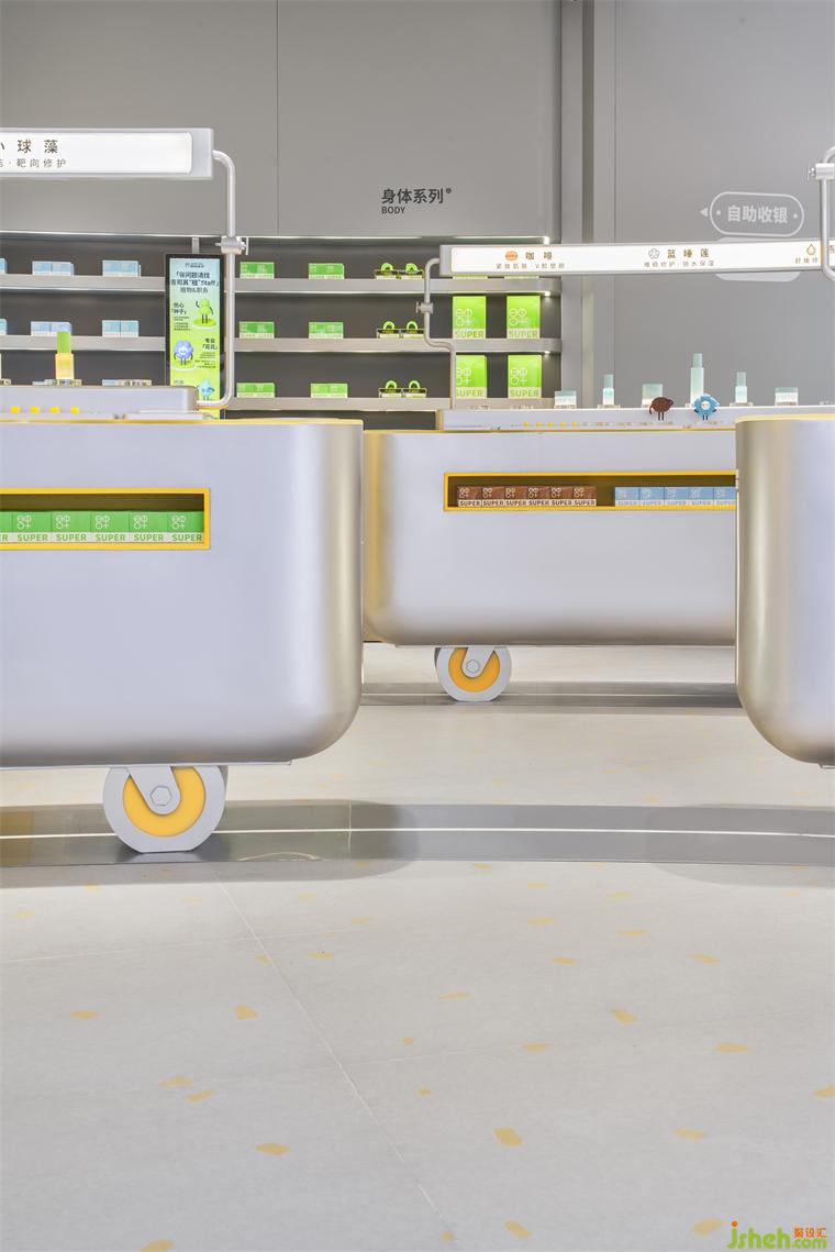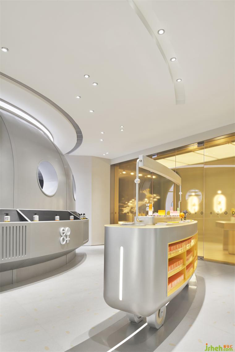 基于空間布局,設計師以弧形導軌進行導臺的布局,裝修設計未來農場里的運輸車化身為飽含科技感的主題島臺,加入植物灌溉系統(tǒng)設計元素,強化場景的現(xiàn)場感。