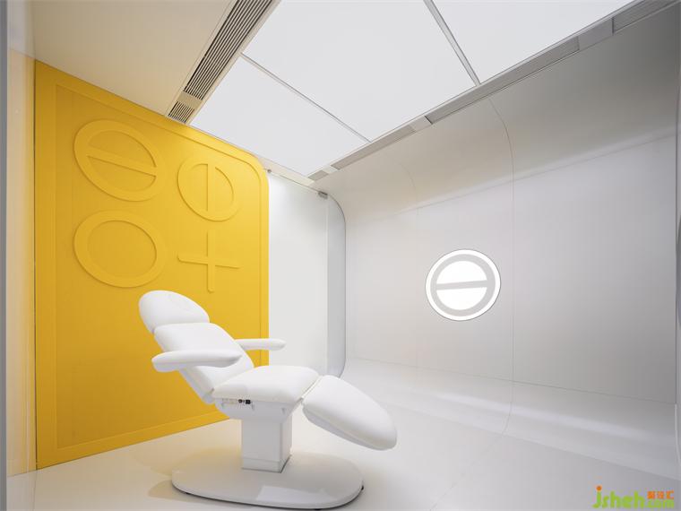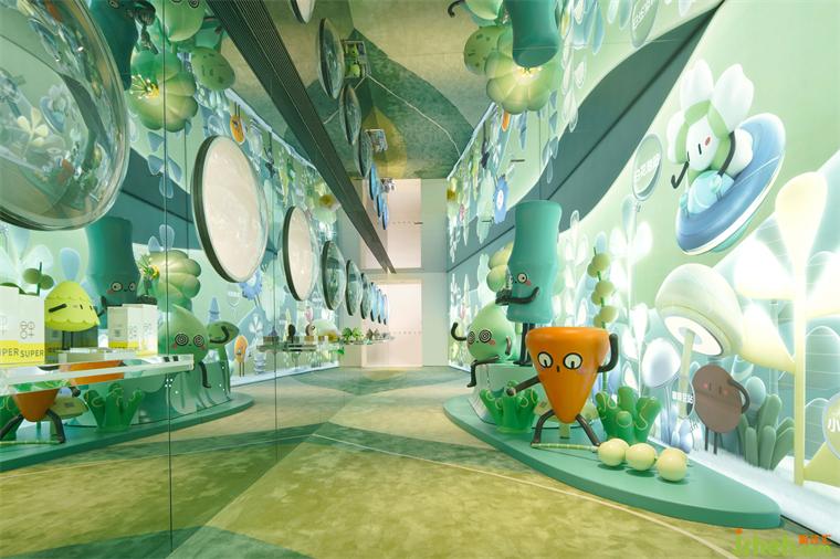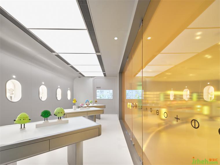 在空間動線的末端,設(shè)計師不忘緊扣腳本,將消費者帶入到故事腳本的高潮部分。設(shè)計師巧妙地將品牌的植物IP以裝置藝術(shù)的設(shè)計手法融入狹長的回廊中,通過動態(tài)燈箱模擬植物在實驗室中場景,裝修設(shè)計光源的閃動模擬植物呼吸的韻律,展現(xiàn)出植物蓬勃生長的強大能量。在沉浸式的場景中,消費者潛移默化地將植物的生長律動與品牌強調(diào)的天然純粹進行聯(lián)想,裝修設(shè)計從而對品牌有了更清晰和深入的感知。