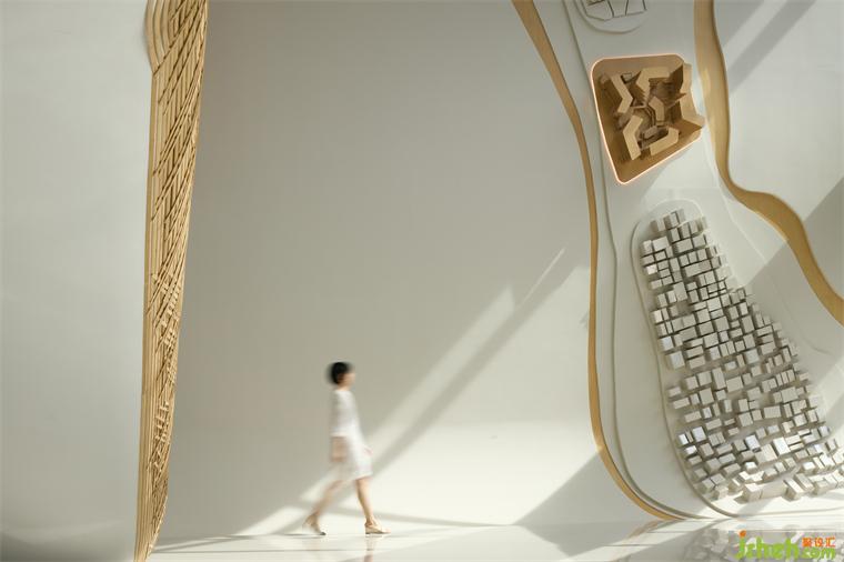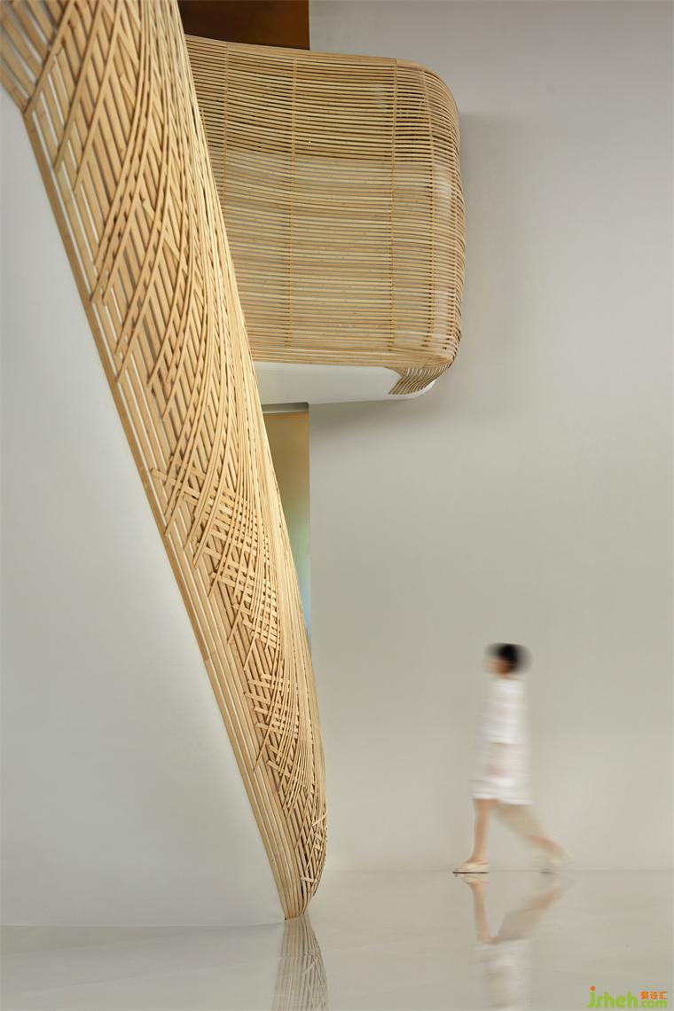 連接上下兩層空間的樓梯由工人在現(xiàn)場以白竹片手工編織而成,代表未來的白竹,裝修設(shè)計也呼應(yīng)榕樹根莖和榕須的生生不息,當清晨的陽光逐漸照亮展廳,竹編樓梯散發(fā)出溫潤的力量。